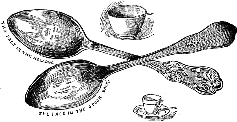 Here's a precursor to The Mirror Has Two Faces, from Pictures and Songs for Little Children, 1888.  The text reads, "The face in the hollow.  The face in the spoon back."
