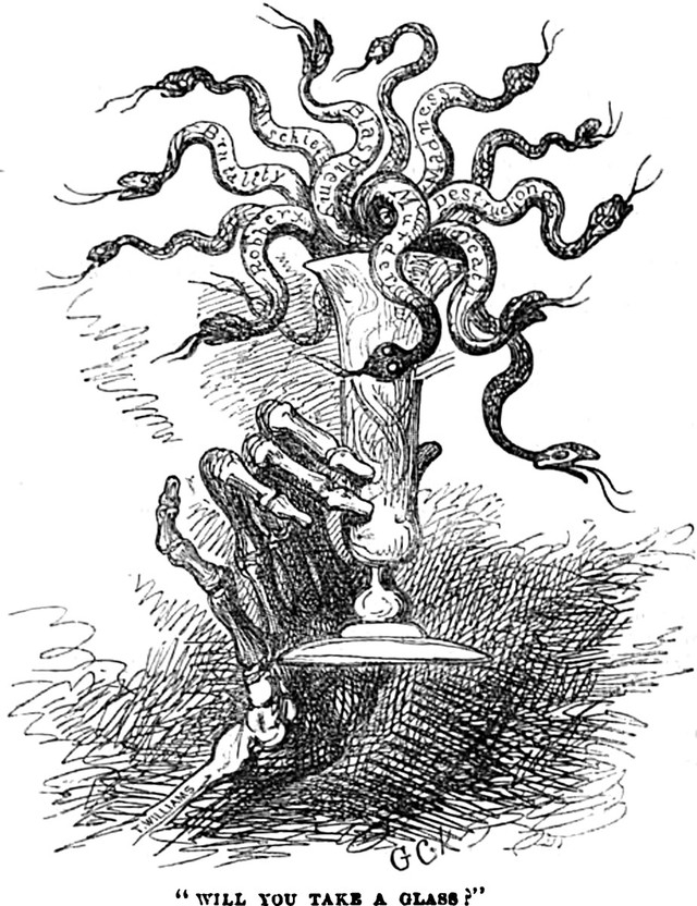 The serpents are emblazoned with death, destruction, murder, mischief, madness, brutality, robbery, and blasphemy. From The Working Man's Friend and Family Instructor (1833). The caption reads: "Will you take a glass?"