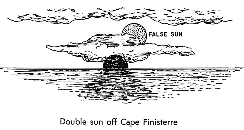 Twin suns possibly created by a lateral mirage.  From our review of the Handbook of Unusual Natural Phenomena by William R. Corliss (1977).