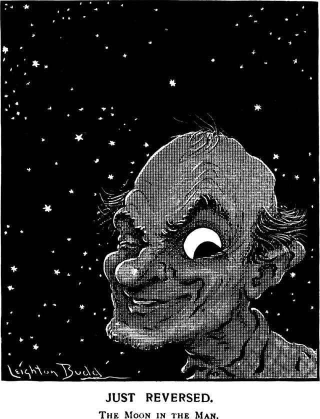 An illustration from a 1906 issue of Puck magazine.  The caption reads: "Just Reversed: The Moon in the Man."