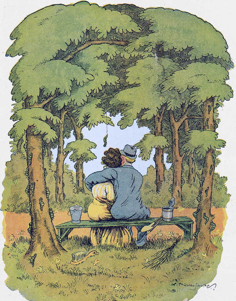 Like caterpillars spinning wombs out of sunlight, so are the days of our lives. (By the way -- notice the tree bark -- dozens and dozens of caterpillars are inching their ways up the trees!) From Lustige Blätter, 1918.