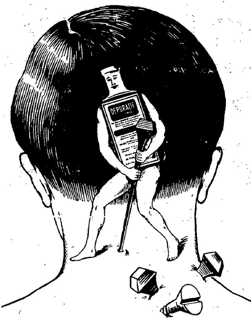 #vintage illustration #vintage ad #anthropomorphism #neck pain #pain medicine #pain in the neck #ad