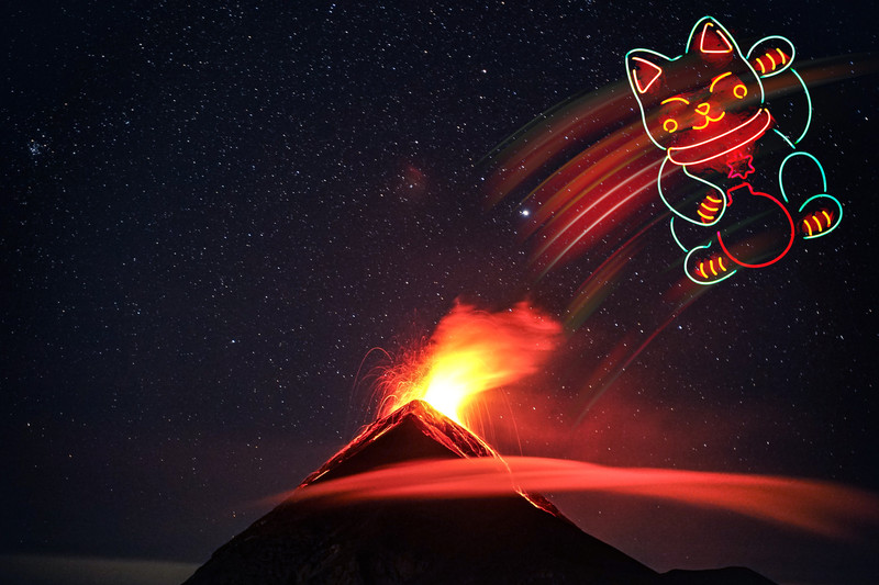 Thanks to Corwin Watts, who, after watching the Neons Gone Mad game walkthrough, imagined a neon cat surfing down an erupting volcano. We tried it — and it all went off with a bang.
