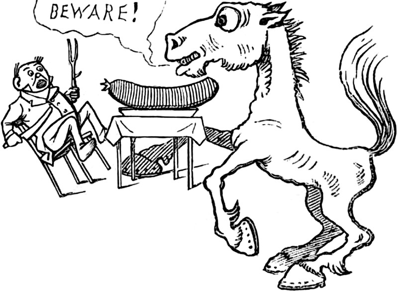 #vintage illustration #horse #beware #warning #giant sausage #never eat anything bigger than your head #illustration