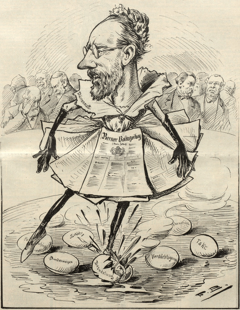 Wearing a newspaper dress while dancing on eggshells.  From Nebelspalter, 1903.