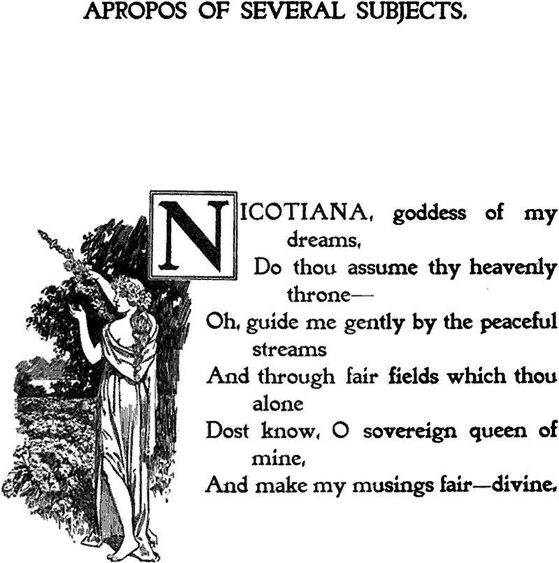 "Apropos of several subjects," a prayer to the nicotine goddess.  From Over the Hookah by George Frank Lydston, 1896.