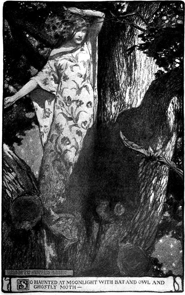 An illustration from a 1901 issue of Harper's magazine. The caption reads: "So haunted at moonlight with bat and owl and ghostly moth."