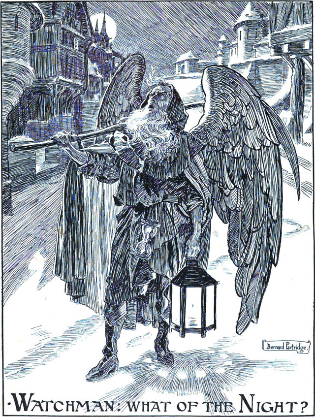 An illustration from a 1900 issue of Punch magazine.  The caption reads: "Watchman: What of the Night?"