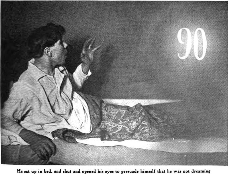 An illustration of a glowing "90" from a 1914 issue of Cosmopolitan magazine. The caption reads: "He sat up in bed, and shut and opened his eyes to persuade himself that he was not dreaming."