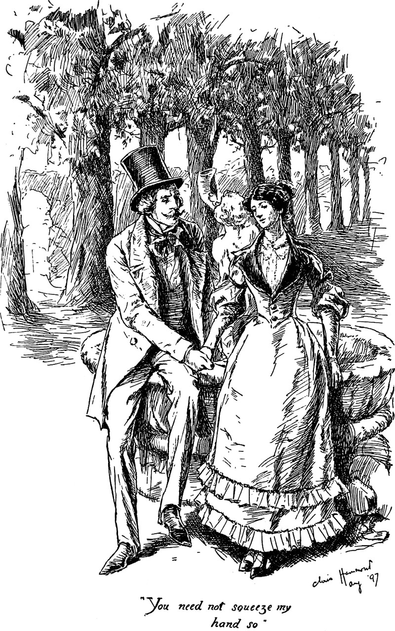 "You need not squeeze my hand so," from The Newcomes by William Makepeace Thackeray and illustrated by Chris Hammond, 1898.