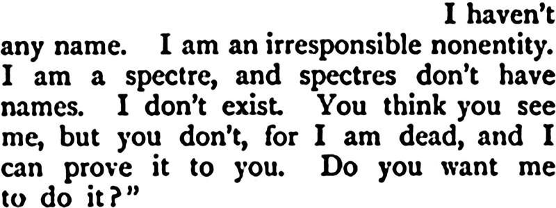 From The London Magazine, 1902.  The text reads, "I haven't any name.  I am an irresposible nonentity.  I am a spectre, and spectres don't have names.  I don't exist.  You think you see me, but you don't, for I am dead, and I can prove it to you.  Do you want me to do it?"