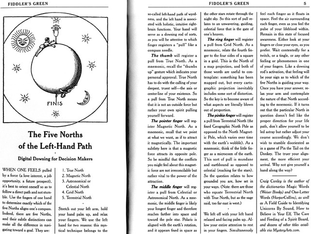 This illustration from Improvement Era, 1953, invites us to revisit our piece on "The Five Norths of the Left-Hand Path," as featured in Wonderella's Fiddler's Green: Art and Magic for Tea-Drinking Anarchists, Convival Conjurors & Closeted Optimists.  Our piece is for those who feel pulled by a force (a love interest, a job opportunity, a future prospect), and we explain how to use the fingers of one hand to determine exactly which of the five norths aligns one's compass so as to best navigate toward a goal.