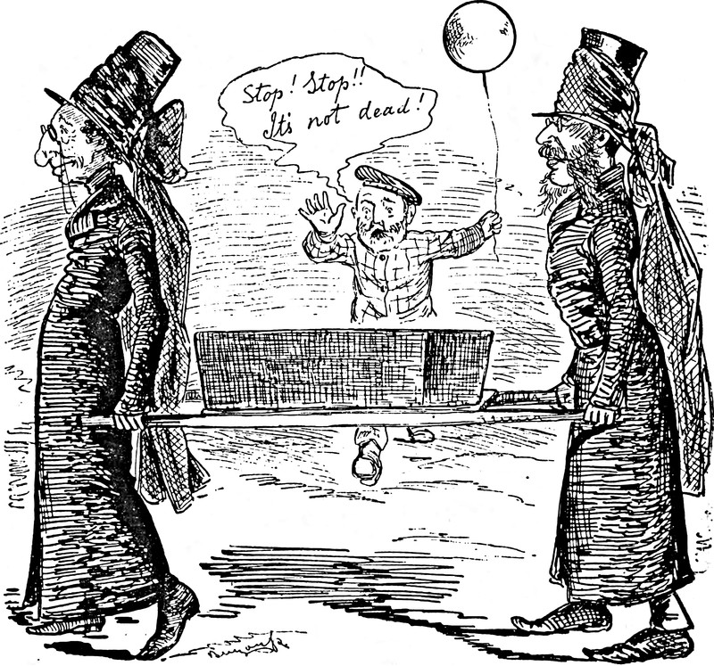 "Stop! Stop!!  It's not dead!"  From Grip, 1882.