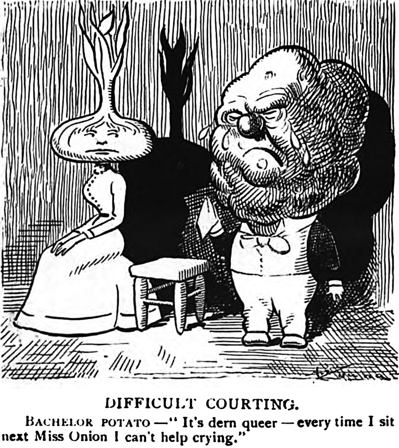 When an onion sings, potato eyes will get teary.  From Vegetable Verselets for Humorous Vegetarians by Margaret Hays, 1911.