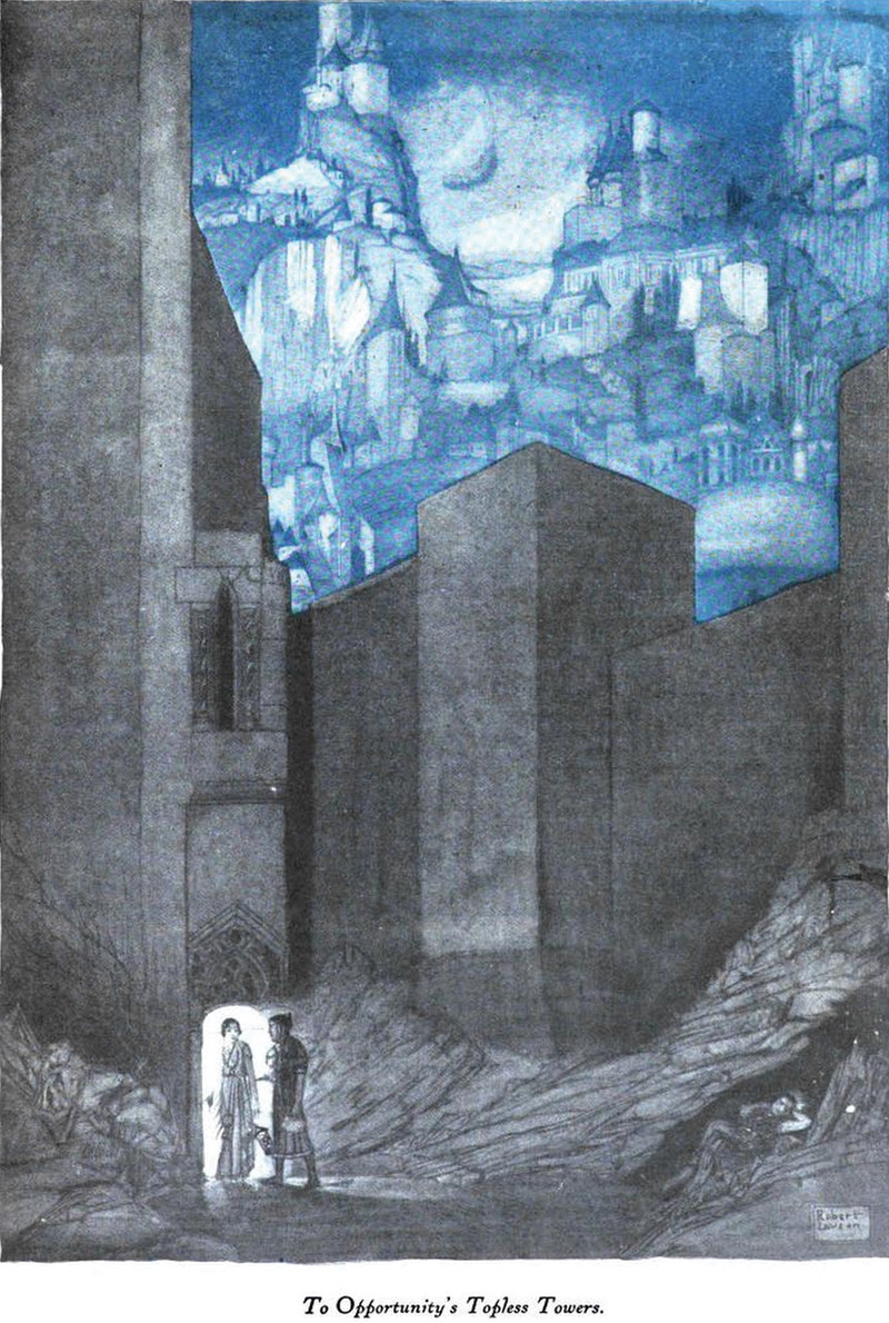 Opportunity always goes topless and is incurably exhibitionistic.  That's the origin of "windows of opportunity."  The caption to this piece reads, "To opportunity's topless towers."  From Everybody's Magazine, 1920.