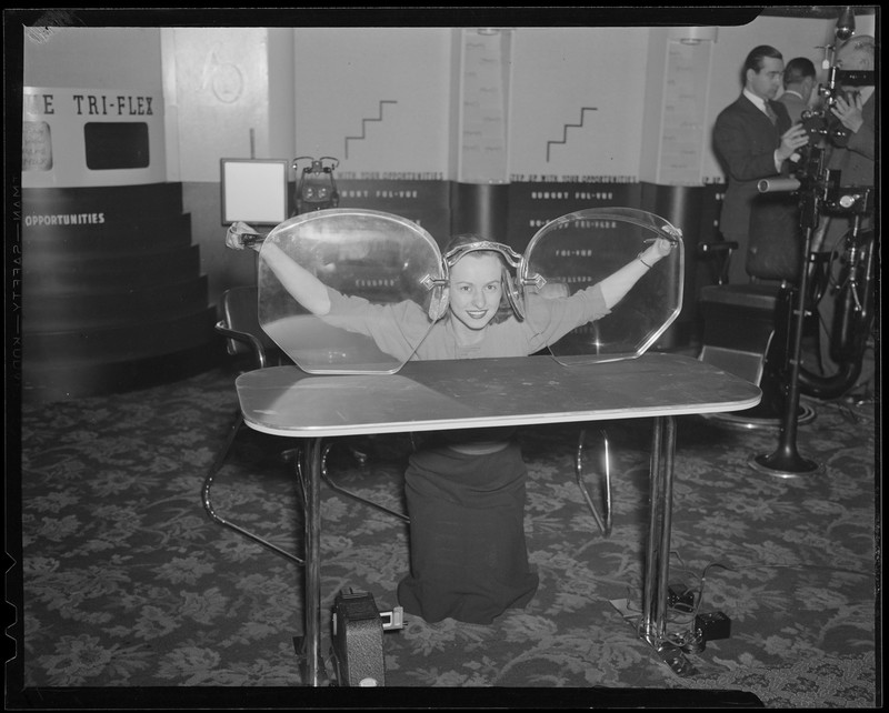 "The upper rim of the currently fashionable giant eyeglasses reinforces the elevated eyebrow gestalt" (Bulletin of the Menninger Clinic, 1978). Photograph by Leslie Jones, date uncertain.