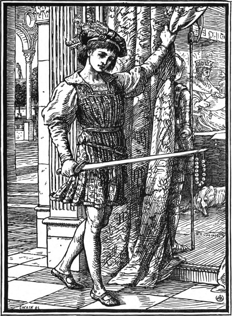 Here's a page of swords with a string of beads on the point of his sword, from The Necklace of Princess Fiorimonde and Other Stories by Mary de Morgan, 1880.