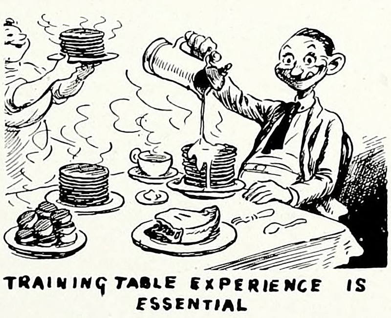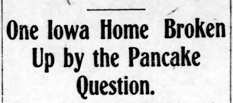 "One Iowa home broken up by the pancake question." Her husband's facial expression while eating her pancakes "was such that it might work permanent injury to her health." From the Duluth Evening Herald, 1906.