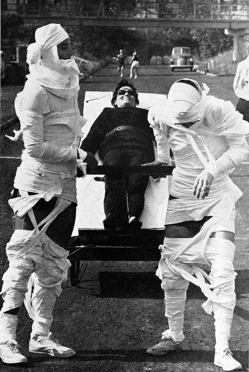 Yes, even mummies can have their pants fall down.  From Kansas State University's 1964 yearbook.