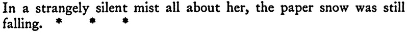 "In a strangely silent mist all about her, the paper snow was still falling."  From New Adventures of Alice by John Rae, 1917.