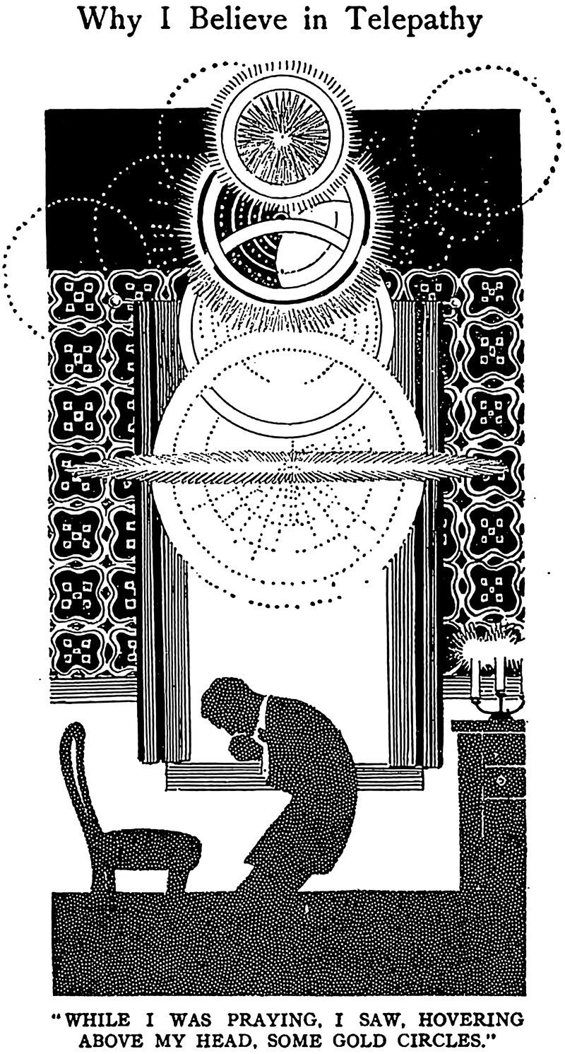 "Why I believe in telepathy":  an illustration from a 1912 issue of Hampton's magazine.  The caption reads: "While I was praying, I saw, hovering above my head, some gold circles."