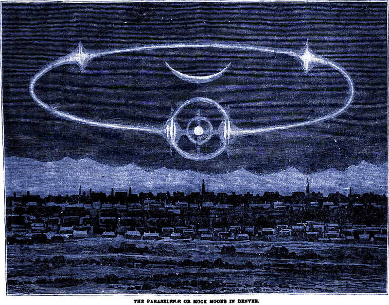An illustration from an 1881 issue of Frank Leslie's Sunday magazine.  The caption reads: "The paraselenae, or mock moons, that appeared over Denver, Colorado on Feb. 14, 1882."