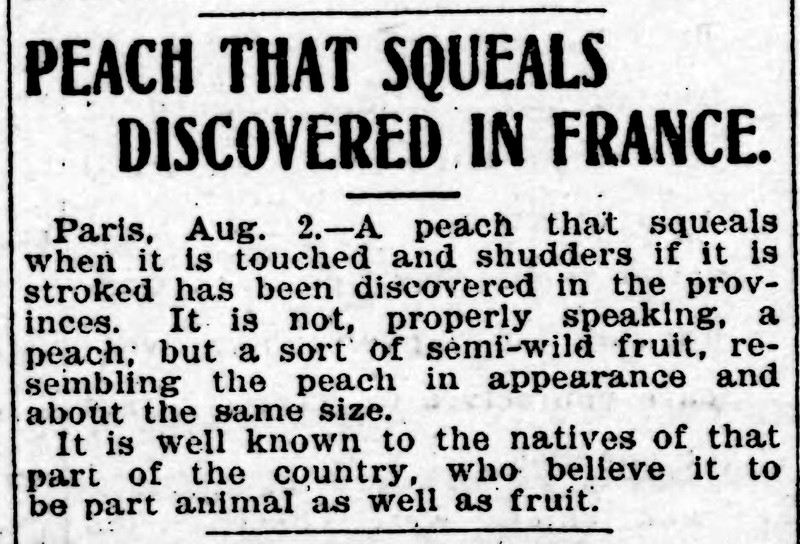 A French peach that squeals when touched and shudders when stroked is believed to be part animal and part fruit.  From the Duluth Herald, 1906.