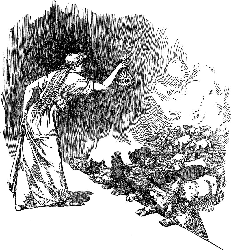 The reason not to cast pearls before swine is that they want cold, hard cash.  From Blasts from The Ram's Horn, 1902.