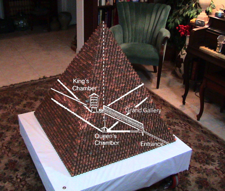 The secret of the Great Penny Pyramid (see original photo here) is that a roll of quarters is hidden inside the King's Chamber.