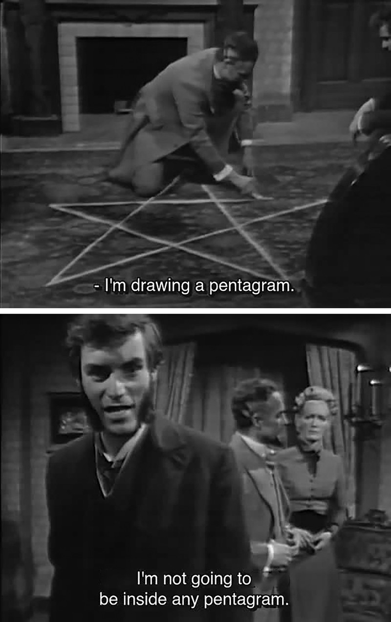 The text reads, "There's no such thing as an "inverted pentagram." The so-called inverted pentagram is merely an upright pentagram tilted 36 degrees. Indeed, there's no such thing as an inverted pentagram, for such is a mathematical impossibility."
