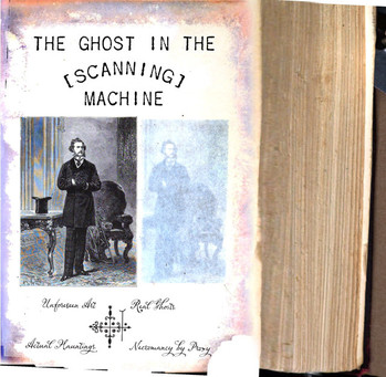 This recalls our repository of ghostly images that were never meant to be, entitled The Ghost in the [Scanning] Machine. The specters were conjured unwittingly, through a mechanical process of book scanning. Their portraits technically do not exist, except within this context. To explain: in old books, frontispieces were typically protected by a sheet of translucent tissue paper. So thorough is the Google Books scanning process that even this page of tissue paper is scanned. The figure in the plate beneath the tissue—"beyond the veil,” as it were—emerges as from a foggy otherworld. The frontispieces were never meant to be seen this way. Their wraithlike manifestations have been artificially "fixed" in time by the scanning process. In essence, timeless phantasms of dead writers have been captured and bound into a new age. And so we call this phenomenon "unforeseen art," as it constitutes an aesthetic expression without original intent. Just as artists often credit their inspiration to a Muse, the accidental art herein is in the domain of real ghosts; every author here has departed to the Other Side. We call it "necromancy by proxy," as the scanning machine serves as our "spirit medium" or shaman.