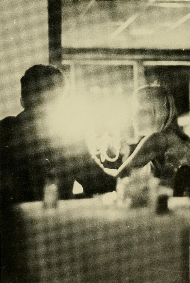 This haunted photograph appears in the Cape Cod Community College yearbook of 1968. Why are strange glows so ghostly? Such lights are perhaps manifestations of what Ross Chambers calls "flauntology." Chambers notes that when a metaphysical subject matter is inexplicable, to demonstrate or manifest that inexplicibility requires abstaining from any attempt to explain it away, with the aim to make hauntedness haunting and not to lay the ghosts; "to demonstrate or display without explanation is ... to flaunt .... [I]t is the flaunting of hauntedness that makes hauntedness haunting. If it is true that there is no ontology without a hauntology, it seems to be also the case that there can be no hauntology without a flauntology, since flaunting names the apodictic gesture, the act of relay, that, in causing hauntedness to be seen, makes it haunting. Flaunting is, par excellence, the gesture of visibility" whereby the lacking object can be figurally presented as an interpretive, recognizable object that haunts (Untimely Interventions).