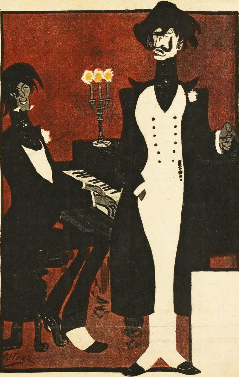 An aspiring mustache and a happy pianist.  From L'Assiette au Beurre, 1902.