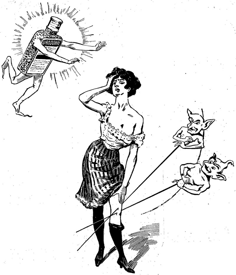 #vintage illustration #vintage ad #demon #imp #pain #pierced #medicine bottle #ad