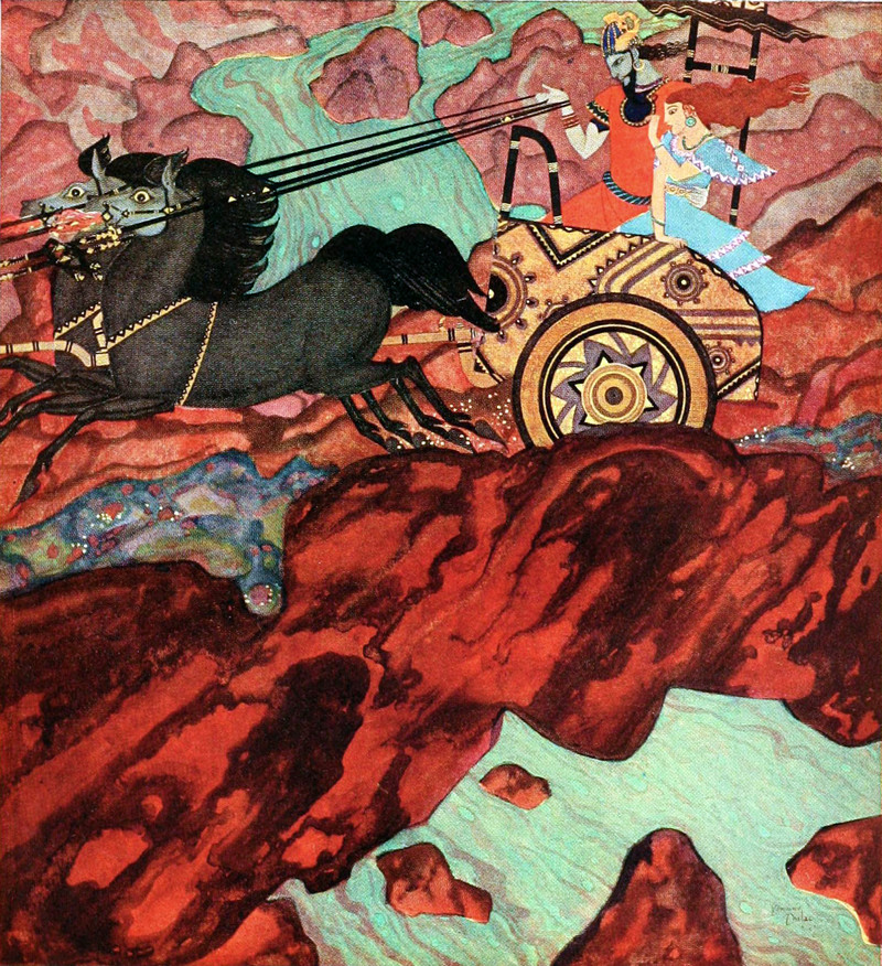 King Pluto's chariot.  From Tanglewood Tales by Nathaniel Hawthorne and illustrated by Edmund Dulac, 1919.