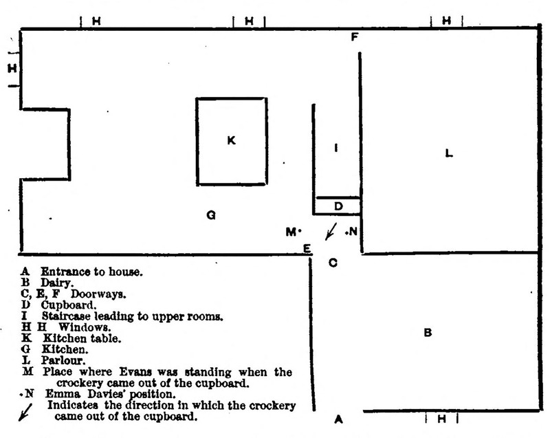 The arrow "indicates the direction in which the crockery came out of the cupboard."  From Journal of the Society for Psychical Research, 1884.