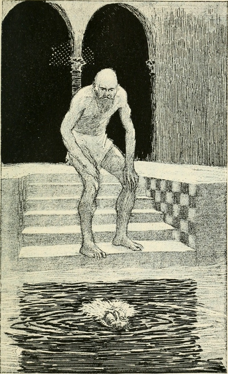A reflected beard will spread in the water.  From The Adventures of Hajji Baba of Ispahan by James Justinian Morier and illustrated by H. R. Millar, 1895.