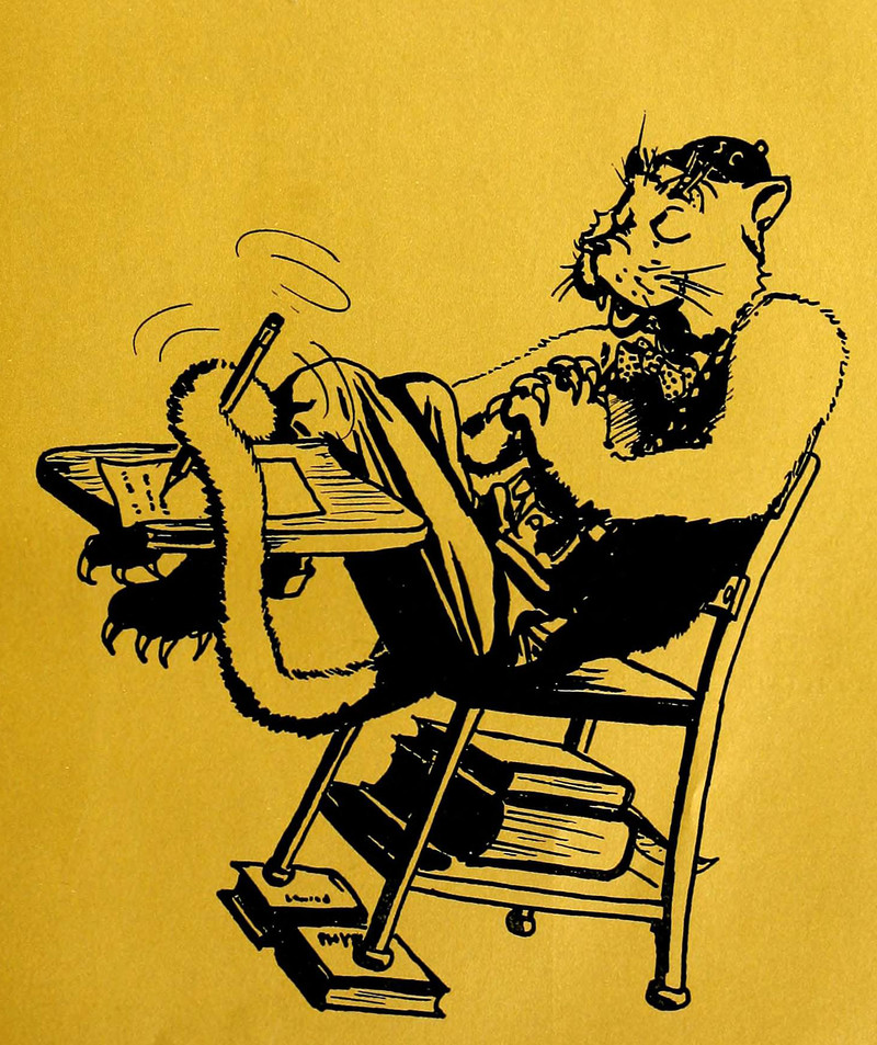 Taking notes with his tail, while sleeping.  From Birmingham-Southern's 1947 yearbook.