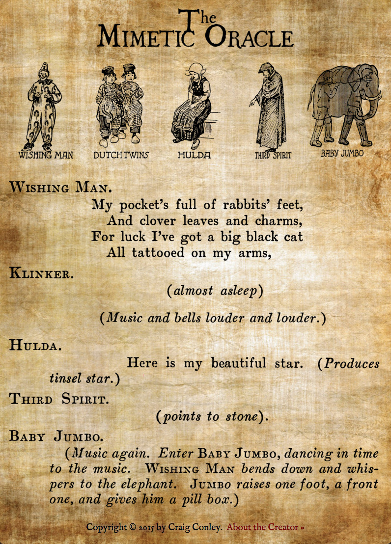 We don't vote, but due to our mysteriously esoteric studies we're often asked for oracular predictions of elections.  For the result of the 2016 presidential election, we consulted our own Mimetic Oracle, and here's why: politics is a grand pageant, and it's been said that theatre reveals what is behind so-called reality.  Our Mimetic Oracle draws from 92 characters in six vintage plays, with 166 spoken lines and 31 stage directions in the mix.  With the system, one randomly draws five characters and generates a script to illuminate the current drama of life.  (There’s a detailed F.A.Q. which explains how the scripts are created, how to make sense of the dialogues, how to determine whether a reading is positive or negative, what to make of the various characters, and why these specific 6 plays were chosen for the system: http://www.mysteryarts.com/play/.)