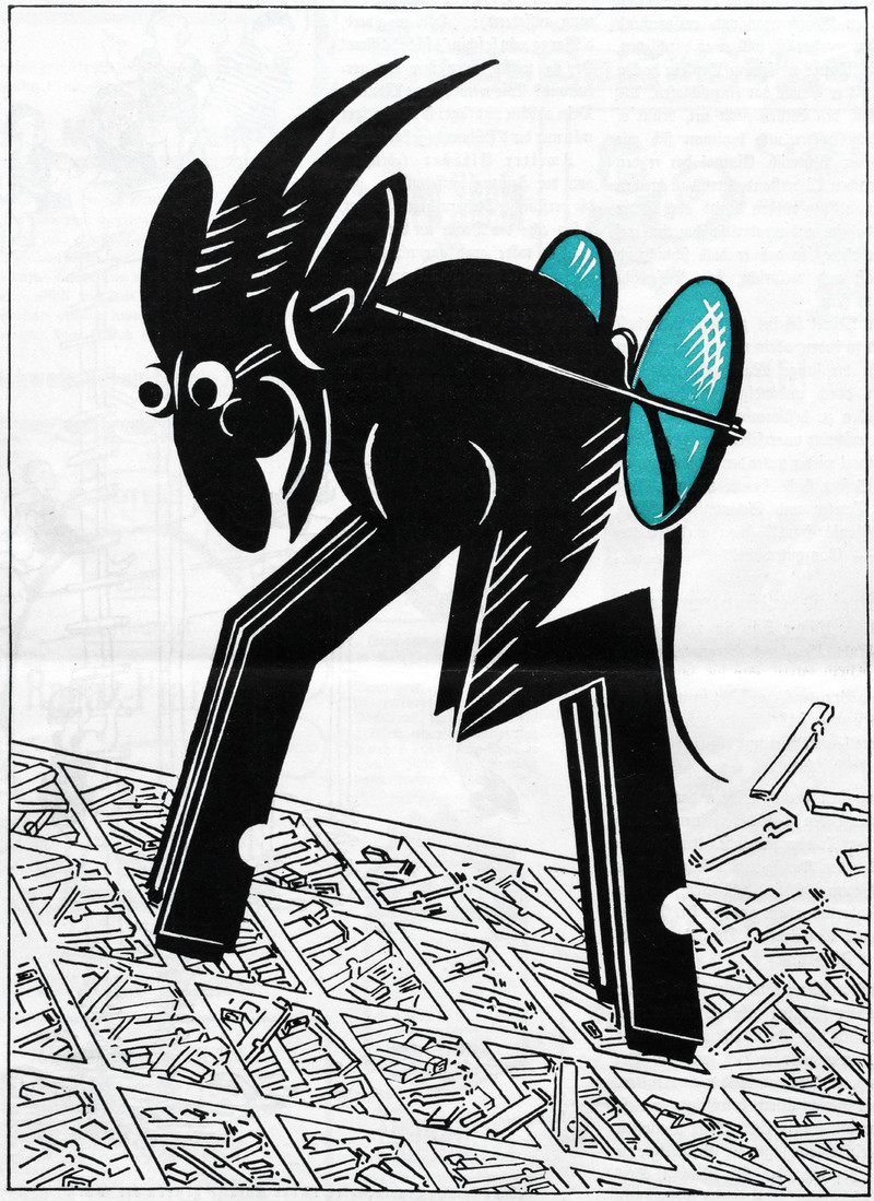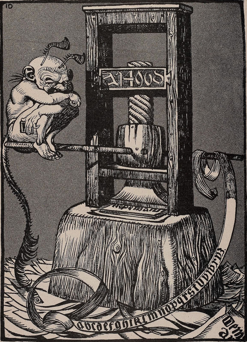 "The misprints devil."  From Nebelspalter, 1923.  Previously, we saw this printing press hobgoblin.