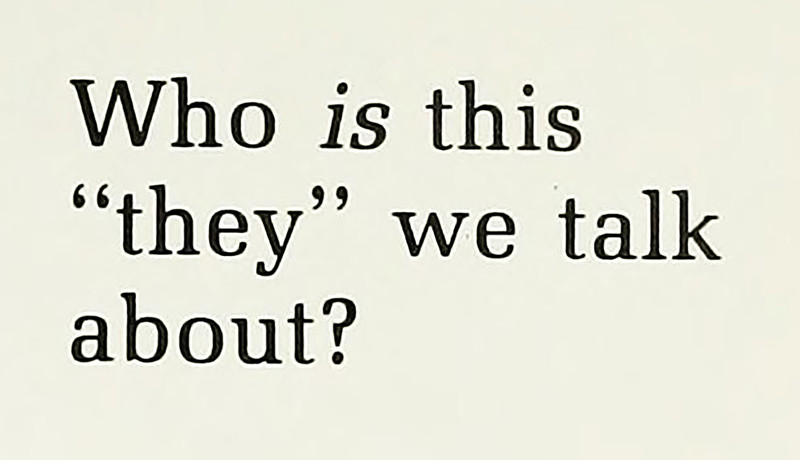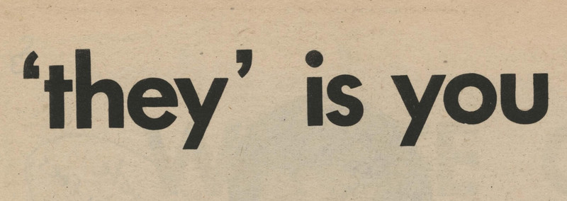 You've seen folks use "they" as a third person pronoun, but it turns out "they" is a second person pronoun.  "'They' is you."  From The Martlet, 1970.