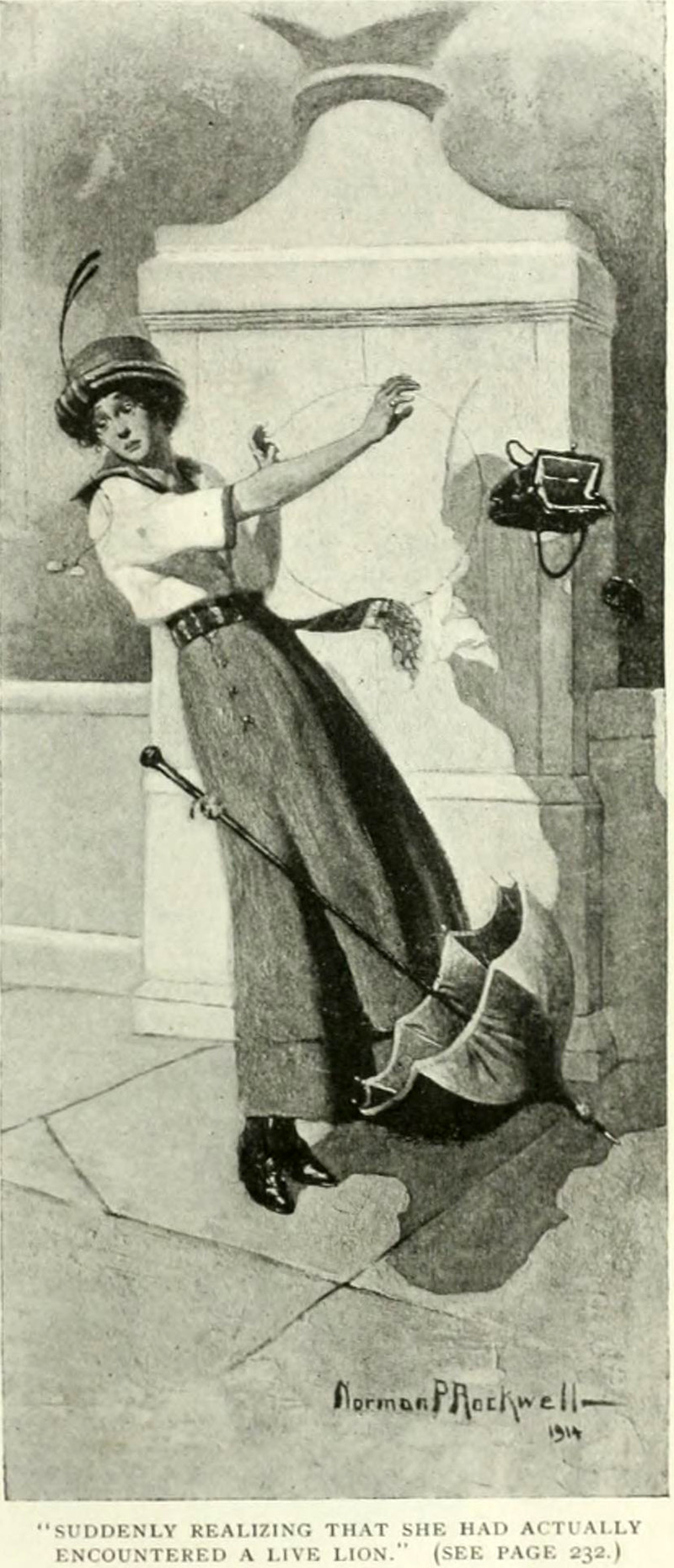 "Suddenly realizing that she had actually encountered a live lion."  From St. Nicholas, 1915.
