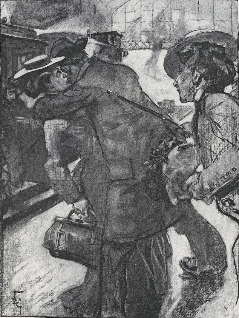 You've seen the famous Life Magazine photo of the sailor kissing a nurse ("V-J Day in Times Square" byAlfred Eisenstaedt). Here it is four decades earlier, from Lustige Blätter, 1904. We're not sure if the lady with the stick hates public displays of affection or merely wants in on the action. (This was Europe, after all.)