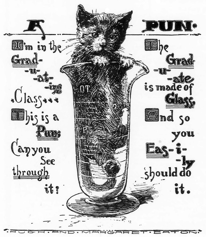 "I'm in the graduating class.  This is a pun.  Can you see through it?  The graduate is made of glass, and so you easily should do it."  From Youth's Companion1904.
