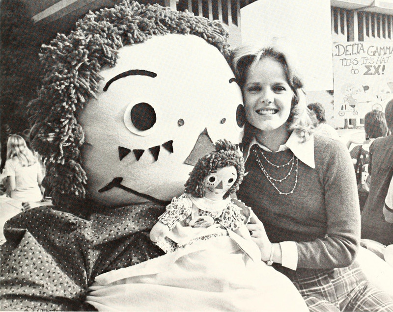 It's ultra common in old yearbooks to see a student's childhood Raggedy Ann doll brought along as a transition object. Here's Raggedy Ann in a dorm refrigerator. From Valparaiso's 1982 yearbook.