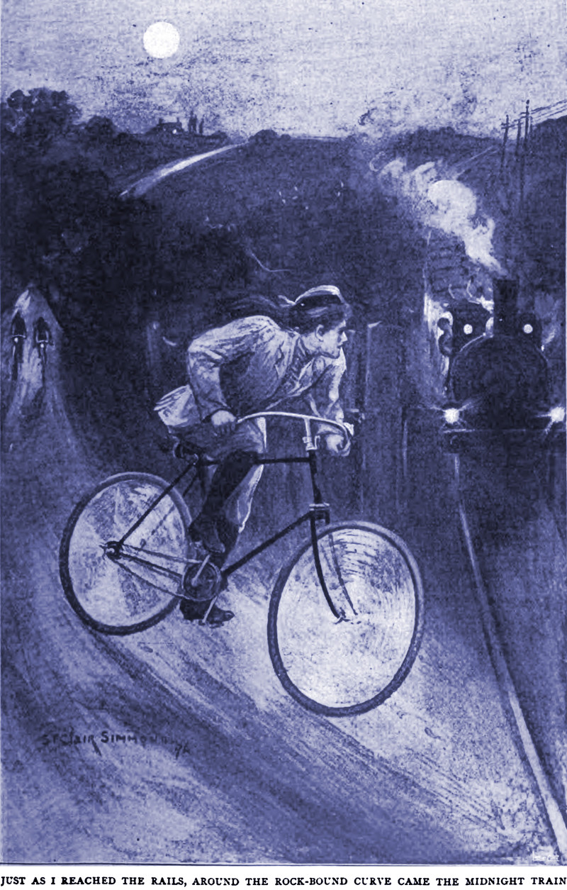 "Just as I reached the rails, around the rock-bound curve came the midnight train."  From English Illustrated, 1896.
