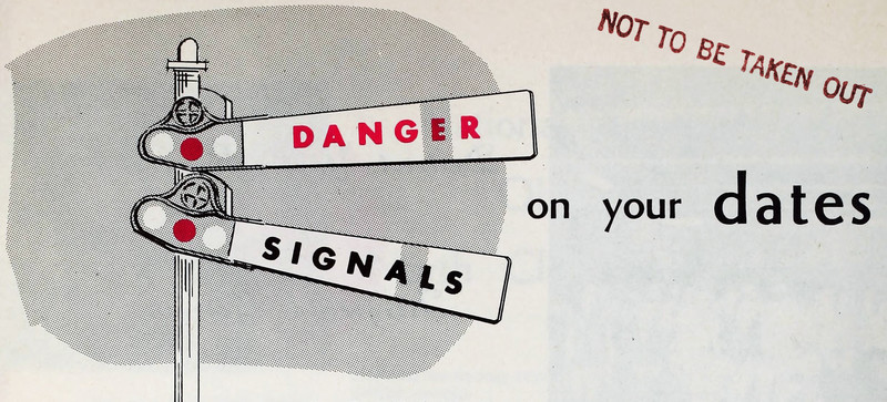 Stopping on a railroad track is one of the first danger signals on a date.  From Lighted Pathway, 1959.