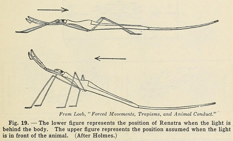 The water scorpion or water stick-insect Ranatra reacting to light.  From Healthful Living, Based on the Essentials of Physiology by Jesse Feiring Williams, 1934.