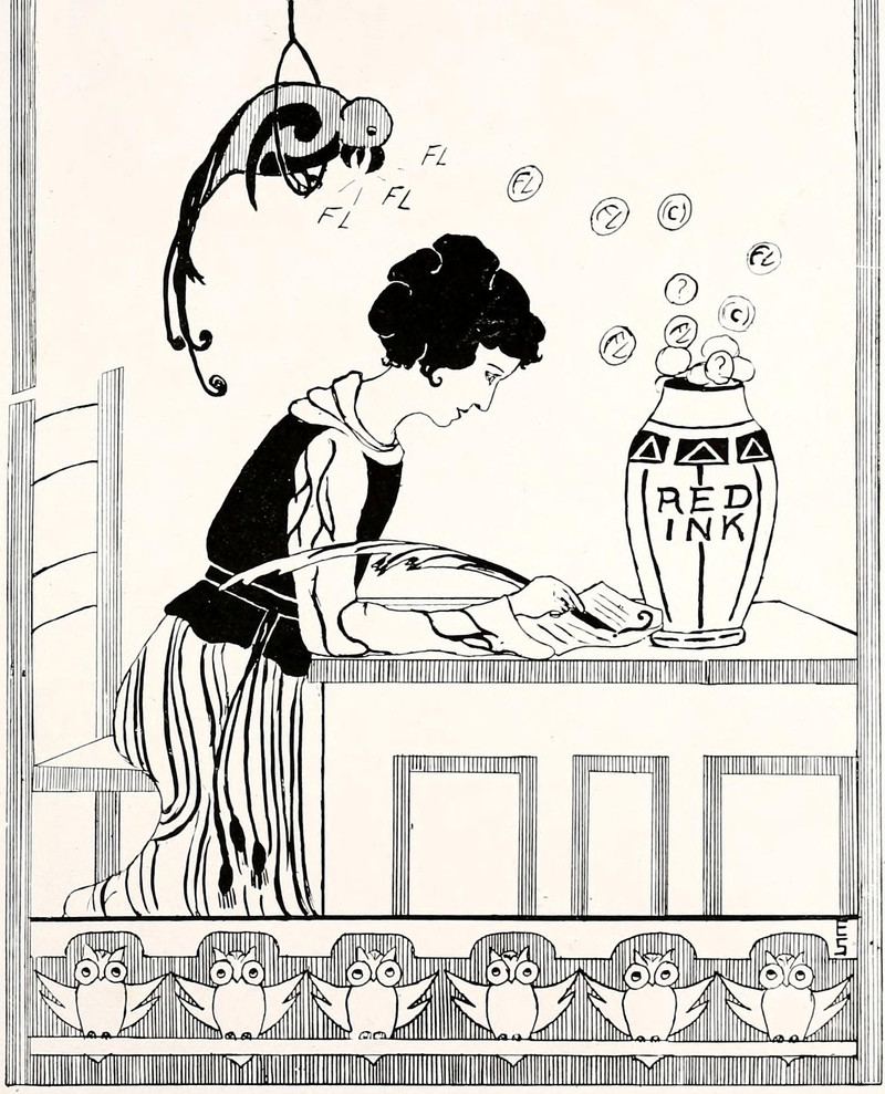 #vintage illustration #owl #parrot #vintage yearbook #yearbook #quill pen #1920s #teacher #red ink