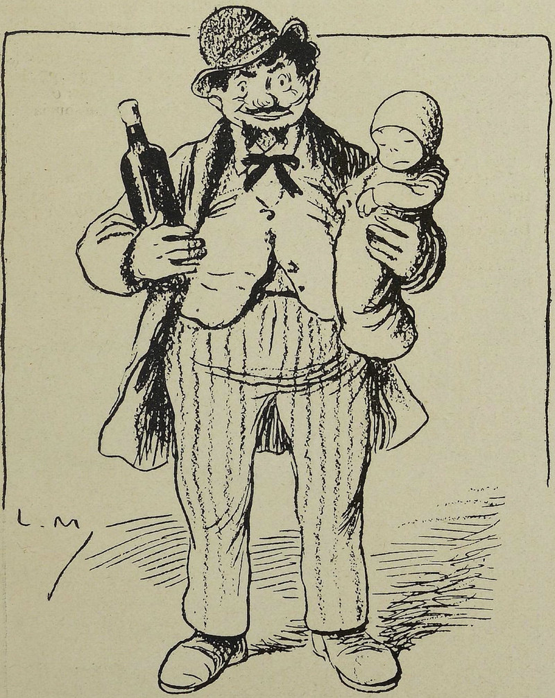 Here's a precursor to the Smell of Reeves & Mortimer running gag about a father who begs for "booze for t'baby."  From Le Rire, 1908.